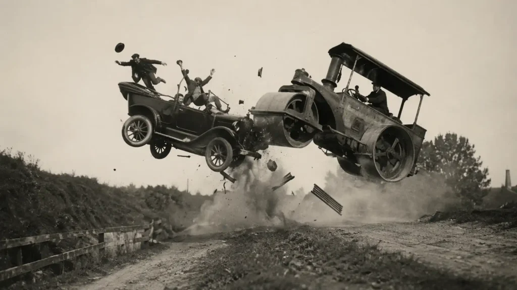 Majoritatea acestor imagini erau realizate pentru divertisment. În această scenă, pasagerii sunt aruncați în aer într-un mod spectaculos, creând o poveste vizuală înainte și după impact.
